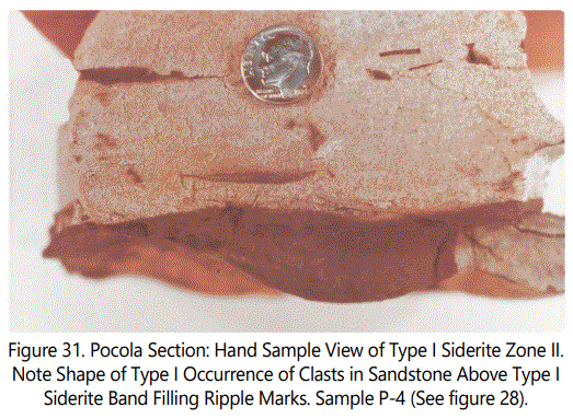 - Thin, massive siderite occurs in the ripple-marked upper surfaces of some sandstone beds.