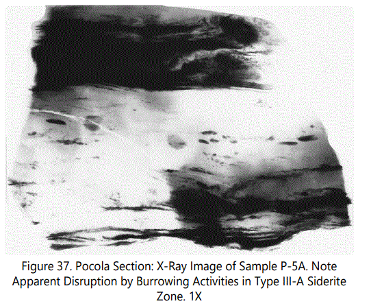 As will be proposed, the zones now consisting of siderite were either organic material (fecal pellets?) or iron-rich (Fe+2 and Fe+3) sediment concentrated by bottom currents during periods of slow deposition. The material became a gel-like mud and was either syngenetically altered to siderite or syndiagenetically altered first to chamosite (and/or pyrite) during the early stage of burial and microbial activity (sulphate reduction). Subsequent to the completion of sulfide reduction and with the introduction of additional Fe+2 from interstitial solutions, syndiagenetic siderite was formed.