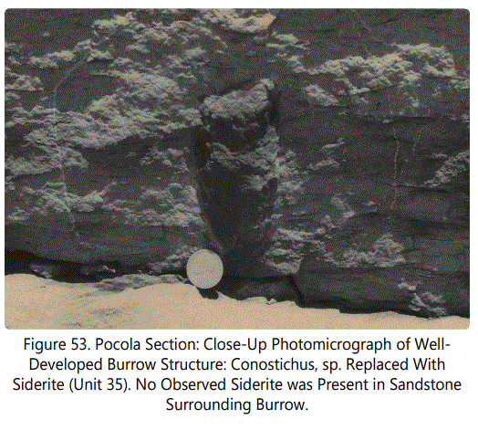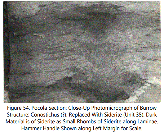Low angle cross-bedding, wavy bedding, bioturbation and trace fossils (in certain intervals, e.g. See figure 4) are characteristic for the intervals from Unit 6 through Unit 16. Siderite zones occur at various intervals within this group, as will be discussed in detail later. Shale partings are discontinuous as are the individual sandstone beds. Shale laminae pinch-out in the sandstone beds along ripple-marked surfaces. The sandstones that show low angle cross-bedding are truncated at various angles by the uppermost ripple-marked surface (flaser bedding). Ferruginous clasts (sideritic) are common at the base of Unit 6, within Unit 16 and in the lower part of Unit 20 near the top of the section. Fossil debris zones (sideritic) also occur in Units 7 and 9 (and Unit 5).