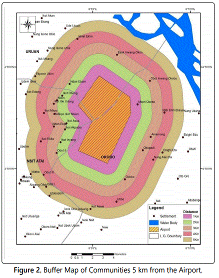 Table 3 presents the communities where the respondents were drawn. A five kilometers (5 km) buffer was drawn around the Ibom International airport and all the communities were listed according to buffers (1 km, 2 km, 3 km, 4 km, and 5 km). A buffer was used to delimit the study area to enable the research study the distance decay in the area of income. Ten percent of the communities were selected at random from each of the buffer levels. Ten percent is the minimum level for any sample to considered valid [8]. The buffer map is presented in figure 2.