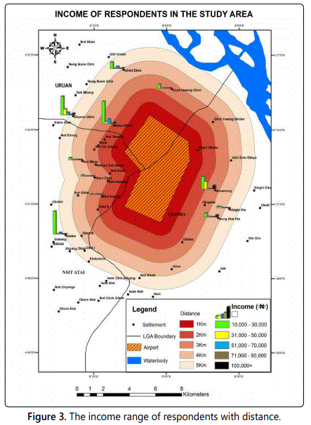 A buffer was used to demarcate the study into zones and a systematic sampling technique was employed in selecting the households to be sampled. The sample size composed of 400 respondents and this was determined from the population of the host communities using the Taro Yamane formula. Data needed for this study was obtained from questionnaires administered to the 400 respondents. Secondary data was collected from Obong Victor Attah International Airport Development Company. Data collected were analyzed using; percentages, charts, maps and simple linear regression statistical tools. The hypothesis formulated was tested using simple linear regression analysis, the null hypothesis which stated that airport does not significantly impact income.