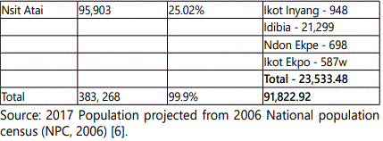 The people are mainly Ibibio's, with Ibibio language as the major spoken language. Ibibio constitute the largest ethnic group in Akwa Ibom state. According to projected population of 2015 by the Ministry of Economic Development Uyo, Akwa Ibom State, Nsit-Atai has a population of 99,164, with 50,242 males and 48,922 females. Okobo has a population of 138,828; made up of 70,790 males and 68,038 females. Uruan, has a population of 95,576 this is composed of 48,920 males and 46,656 females. Population of the study area was vital to the study because population is pivotal to the development of any region.
