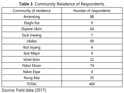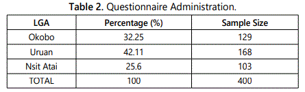 In administrating the questionnaire, quota system was used. The LGA's were given questionnaires based on their percentage contribution to the total population. Okobo was given 32.25% (129) of the questionnaires, Uruan was given 42.11% (168) and Nsit Atai was given 25.6% (103) of the questionnaires respectively. A systematic sampling technique was employed in selecting households to be sampled.