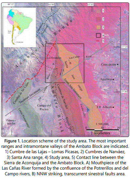 The study area includes from the northern end of the Las Estancias valley to the eastern slope of the Santa Ana range. Las Estancias valley is a tectonic depression that opens to the south to form the Campo del Pucará basin. To the east, the valley limit with the northern end of the Cumbres de Narváez and Santa Ana range and, to the west, with the eastern edge of the Sierra de Aconquija (Figure 1). The region belongs to the morphostructural environment of Sierras Pampeanas Noroccidentales [1], where the Nazca plate sinks at a low angle below the South American plate [2]. The north end of the Ambato Block joins the southeastern edge of the Sierra de Aconquija (Figure 1).