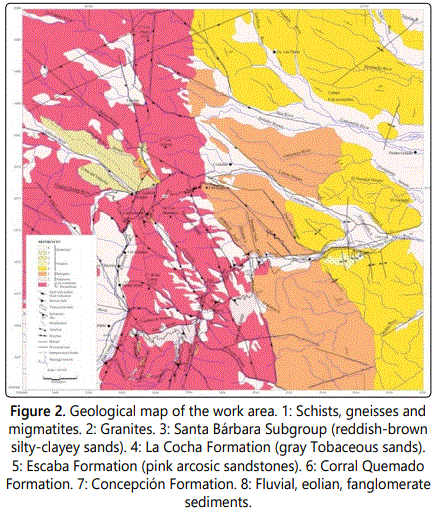 The sedimentary sequence is represented from the base to the top by sandstones and claystones of red brick color, tobaceous sandstones and gray colored sandy tuffs and thick arcosic sandstones of gray and pink colors, superimposed by volcanic conglomerates. From the eastern flank of the Santa Ana range to the east are the best outcrops of sedimentary sequence, folded, with more than 100 m thick. They are arranged on igneous and metamorphic rocks and in some cases are covered by silty-sandy sediments or quaternary conglomerates. The volcanic conglomerates only appear in the northwestern area (Figures 2 and 3).