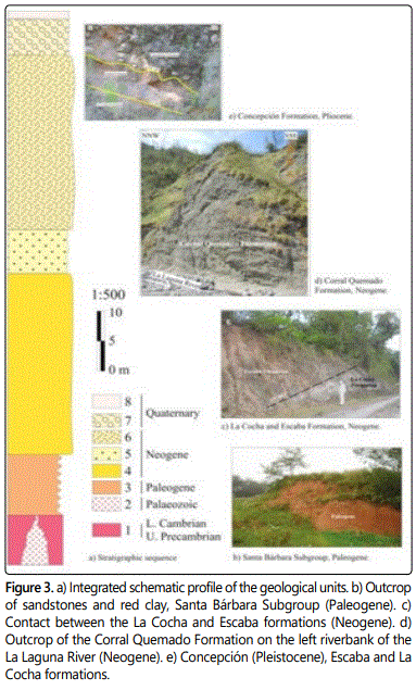 In the gray tobaceous sandstones (La Cocha Formation) that outcrop in the El Naranjal and Villa Lola areas, at the base of the eastern slope of the Santa Ana range, 52 structural joints planes were measured. The average principal strike of these planes is 72°/207° and the data population represents two main structural planes (59°/194° and 79°/344°) (Figure 12d).