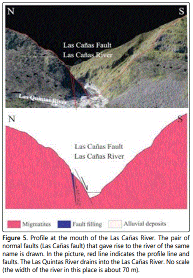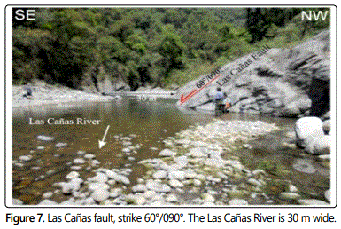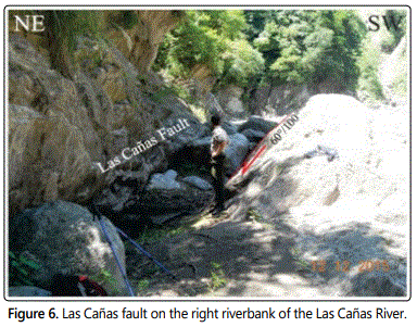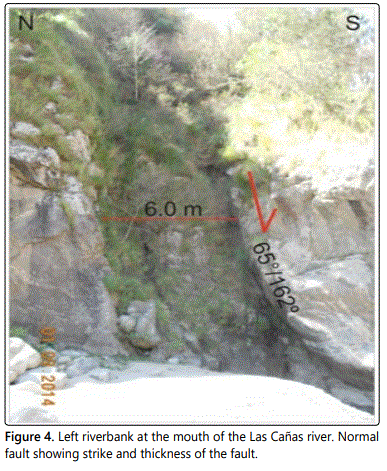 The Las Cañas River was formed by the Las Cañas normal fault that dismembered the metamorphic basement. The upper course of the Las Cañas River drains eastward, but the Santa Ana lineament twists its course towards the NNE, then shifts to the east at the confluence with the Clavillo stream. The Miranda fault gives to the Las Cañas River again sharp changes to the south and north, in a stretch of about 700 m, and then continues dripping to the east (Figure 2). Las Cañas fault is a system of normal faults with southeast dipping. At the mouth of the Las Cañas River, on the left riverbank (Figure 1A), there is a wide groove of erosion that corresponds to a normal fault zone, with a 65°/162° strike (Figures 2 and 4). The width of the tectonized and brecciated zone over the Las Cañas River is 6 meters and is limited by parallel joint planes with 75°/162° strike (the northern wall) and 60°/162° strike (the southern wall). The fault gap is made up of highly fractured blocks of rock, separated by cracking planes that have friction mirrors and clay fillings. Towards the south wall of the fault is a gap zone (granulation and soap) of 0.50 m thick (Figure 4). However, the width of the Las Cañas River in this area is about 70 m, so there would be a larger normal fault, to the south, parallel to the previous one, through which the river drains and which is covered by the alluvial deposits (Figure 5).