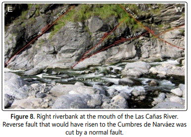 The Las Cañas fault is born at the confluence of the Potrero, Del Campo and Las Quintas rivers, in the Las Estancias valley, and extends for 24 km to the foot of the eastern slope of the Santa Ana range (Figures 1 and 2). It is a sinuous fault, where the Las Cañas River dreins, which in some cases reaches 180 meters wide. The first section of the river, crosses the northern end of the Cumbre de Narvaez with EW strike, up to the Santa Ana lineament. In the Santa Ana lineament it turns to the north and, from the Clavillo stream it crosses the northern end of the Santa Ana range with ENE strike (Figures 1 and 2). The Las Cañas fault also has short breaks, which divert the river to the north and to the south, in the area of the Miranda fault (Figure 2). The Las Cañas fault marks a sudden change in the orientation of the ranges; to the south of the fault the mountain ranges strike NNE and, to the north, NNW (Figure 1). It is a normal fault, which dip to the SE, transverse to the Andean strike, and was formed through the schistosity planes of the metamorphic basement. This structure is prior to the Andean tectonics, is a transversal structure that interrupts the deposits of the Cretaceous rift. In this case allowed the deposition of the upper layers of the sedimentary Grupo Salta sequence (the Santa Barbara Subgroup) which disappear towards the south; as the transverse structures described by Mon R and Gutiérrez AA [28] in the Subandean system.