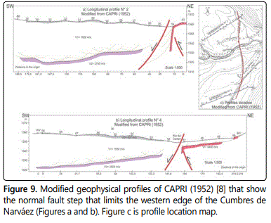 The Narváez fault marks the western edge of the Cumbres de Narváez; to the west, the Las Estancias valley, the Campo del Pucará and the Sínguil valley extend (Figure 1). The western edge of the Cumbres de Narváez is raised, its peneplain slope towards the east, marked this morphology by the Narváez fault. The western edge of the Cumbres de Narvaez is limited by two faults. First, reverse faults dipping toward the east were generated [9], who produced the uplift of the Cumbres de Narváez (Figure 8).