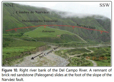 Subsequently, a gravitational fault dipping to the west originated the Las Estancias and the Sínguil valleys. This fracturing scheme is observed in the right riverbank, in the embouchure of the Las Cañas River, the reverse fault (45°/108°) is cut by a normal fault (45°/223°) (Figure 8). The geophysical studies conducted by the CAPRI company in 1952 [8]. In the area of the Las Cañas River mouth (indicated with A in figure 1), determined in two seismic profiles the step of the Narváez fault, with normal displacement and dipping to the west (Figure 9). The reverse fault drawn in the seismic profile was interpreted based on the structures outcrop shown at the right riverbank of the Las Cañas River (Figure 8). This fault limits the western edge of the Cumbres de Narváez, with a step of about 30 m in this area (Figure 9). The normal fault is also observed on the right riverbank of the Del Campo River, in the vicinity of its confluence with the Las Cañas River, where red brick sandstones (Paleogene) are sliding at the foot of the slope of the fault (Figure 10).