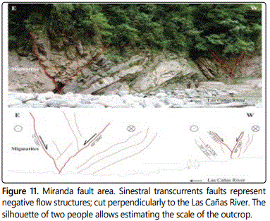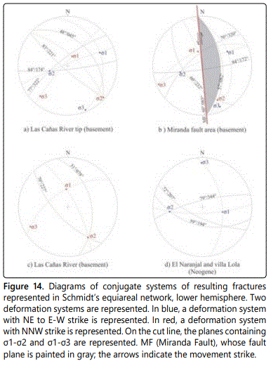 In the areas of the mouth of the Las Cañas River and Miranda fault, four conjugated planes of fracture were determined (Figures 14a and 14b) and in the areas of Las Cañas River and Villa Lola - El Naranjal only two conjugated planes of fracture (Figures 14c and 14d). From the geometry of these conjugated planes, the occurrence of two main deformation events is interpreted. For the first, a NE transpression determined with the data measured in metamorphic basement rocks in the mouths of the Las Cañas river and Miranda fault (Figures 14a and 14b). While with the data measured in the Neogenic rocks an orientation of transpression E-W is obtained, for the same event.