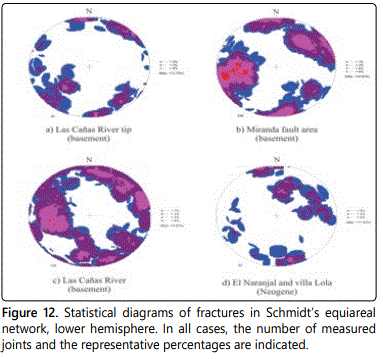 In the Miranda fault area, in a length of 700 m, 226 planes of joints and faults were measured, on both riverbanks of the Las Cañas River. The average principal strike of the data population is 79°/066° and four resulting planes were obtained (57°/082°, 60°/232°, 84°/172°, 70°/320°) (Figure 12b).