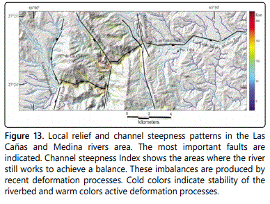 For the purpose of determining active tectonic processes associated with the main structures in the Ambato Block, both of E-W and NNW, and, considering an area of difficult access and scarce outcrops, we resorted to the search for regional deformation indicators. In this sense we carry out an analysis of the incision of the drainage network and its relationship with the topography, to detect sectors where the drainage has not reached equilibrium, due to active tectonic deformation processes, with which they are associated. You can see the close relationship between the warm colors in the drainage network with the location of the most important faults. The zone with recent deformation processes is found from the Miranda fault to the head of the Las Cañas river, mainly associated with the Santa Ana lineament, Miranda fault and Las Cañas fault (Figure 13). Another indicator of active tectonic deformation, at mesoscale, are the Pleistocene conglomerates of the Concepción Formation, arranged at 20°/180°, in erosive discordance on the Escaba Formation (Figure 3e).