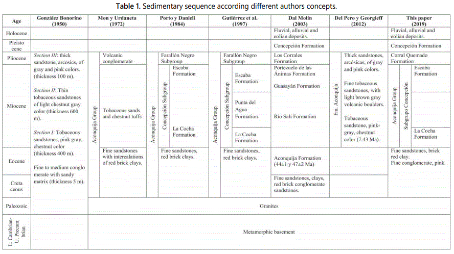 The complete sequence of the Neogene outcrops along the western edge of the Campo del Pucará was described by González Bonorino F [9]. Subsequently, other authors described the sedimentary units in different areas, both from the western edge of the Tucumán basin [13-16] and in the Campo del Pucará and Las Estancias valley [12,14,17,18], assigning different categories and subdivisions (Table 1). We chose to maintain the subdivision of Aconquija Group, Concepción Subgroup, integrated by the La Cocha, Punta del Agua and Escaba formations; however, only the representative sequences of the La Cocha and Escaba formations (Table 1) are presented in our study area.