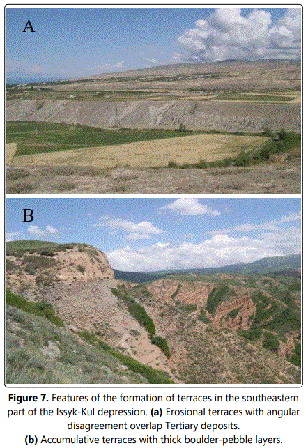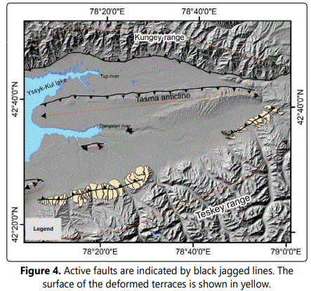If the active faults along the Teskey Range are south vergent, then the Tasma anticline and other structures located inside the depression have the opposite vergence. The zone of active deformations mainly covers the Middle Quaternary and Late Pleistocene terraces. In the foothills of the Teskey Range, the surface of deformed terraces is inclined to the north at an angle of 7-9 °. The inner part, in particular, the edge of the lake terraces of the Tasma ridge is inclined in the form of narrow surfaces in the opposite direction. Thus, the role of the tectonic activity of the region along with climatic factors in the formation and development of topography in the Quaternary was great.
