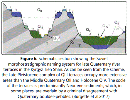 The role of climate in the formation of the relief in the Issyk-Kul depression is very great and the forms of relief created by the influence of the climate in the Quaternary time occupy the foundations of modern landscapes. Extensive terrace complexes in the eastern part of the Issyk-Kul depression formed in the Middle and Late Quaternary (Trofimov 1990; Aleshinsckaya et al., 1971). Series or steps of terraces correspond to large erosional-accumulative stages in the Issyk-Kul depression. In each valley and even in specific parts of the valley, the number of terraces may be different. This is due to the complexity of the structural-tectonic plan, the differentiated nature of the Quaternary movements. Due to the subsequent tectonic deformations, the comparison of terraces in different valleys and in different parts of the valleys is extremely difficult. This circumstance is aggravated by the inconstancy of the basis of the level of erosion of the lake. Issyk-Kul. When studying terrace complexes, we relied on the scheme of Grigorenko, who developed a paleogeographic structure for the development of terraces for the Tien Shan. (figure 6).