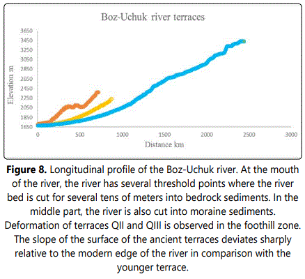Terraces of an accumulative nature, when leaving the Teskey and Kungey ridges, form alluvial cones. The thickness of boulder-gelled deposits reaches from 5 to 50 meters and in some places they overlap the Tertiary deposits with angular unconformity (fig. 5). Erosion of the rivers along the northern and southern slopes of the Teskey and Kungey ranges, as seen from the profile, have a rather steep slope, which is cut into bedrock and looser (fluvioglacial deposits) deposits (fig. 6). The steepness of the river channels gradually decreases towards the depression.
