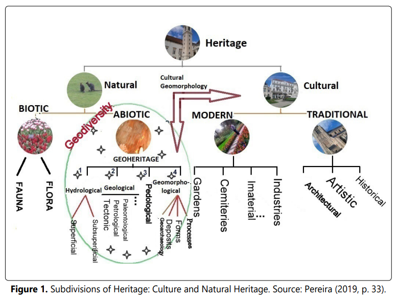 In this work, it is proposed to subdivide Natural Heritage into Biotic, which includes the elements of fauna and flora that, due to their intrinsic value or because they are at risk of extinction, deserve to be protected, whatever ecosystem these forms of life are part of and; Abiotic, where the elements of geodiversity are inserted, such as water resources and their hydrosites, belonging to the Hydrological Heritage, in addition to the landforms, the geological elements and the soil, each with its sub-elements.