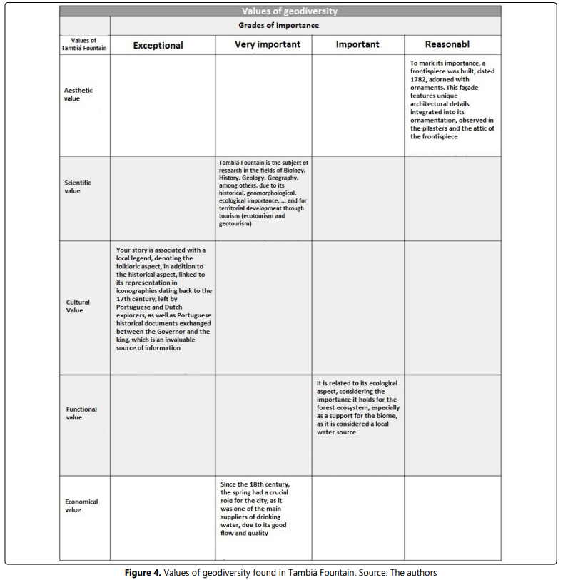 In his iconic work “Geodiversity - valuing and conserving abiotic nature” (Gray, 2004), six values (intrinsic, cultural, aesthetic, economic, functional, and research/educational) and 25 sub-values for abiotic elements of nature are proposed. Considering Tambiá Fountain, the subject of this study, not all of these values are present. Figure 4 presents the values that are present, along with their definitions, and, based on the fieldwork inventory, the level of importance of each value. This is crucial to understanding why this fountain can be considered an example of a hydrosite belonging to the hydrological heritage of the municipality of João Pessoa.