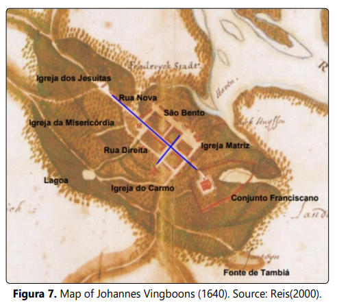 By studying and analyzing these iconographies, it is possible to gain a more comprehensive view of the history of João Pessoa and understand the influences and transformations that occurred during the 17th and 18th centuries. Additionally, these representations contribute to the preservation of the city’s historical memory and provide support for academic research, cultural tourism, and the appreciation of local heritage. In Vingboons’ iconography, dating back to 1640 (REIS, 2000), one can observe that the flora delineated across the territory is denser near bodies of water and settlements, referred to as ‘riparian forests’ (Figure 7). In these lower-lying areas, there were springs that supplied water to the primitive city.