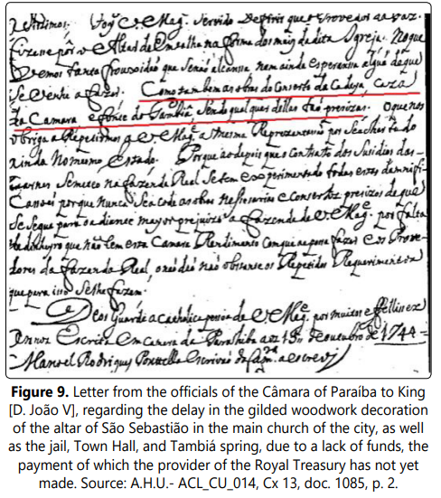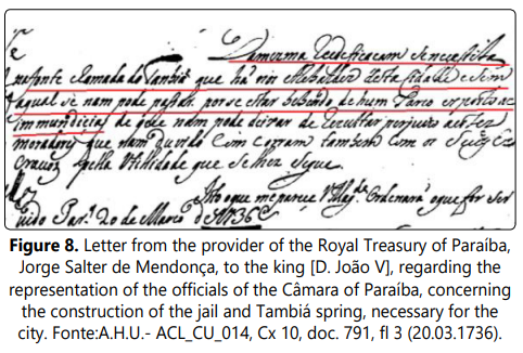 In another letter from the officials of the municipal council to King D. João V of Portugal, dated October 15, 1754, both parties complained that necessary works, such as the jail of the city of João Pessoa and the Tambiá Fountain, had not been carried out (Figure 9). The letter said: “Similarly, the repair works of the jail, Town Hall, and Tambiá spring are also necessary, any of them being equally crucial (free translation)”.