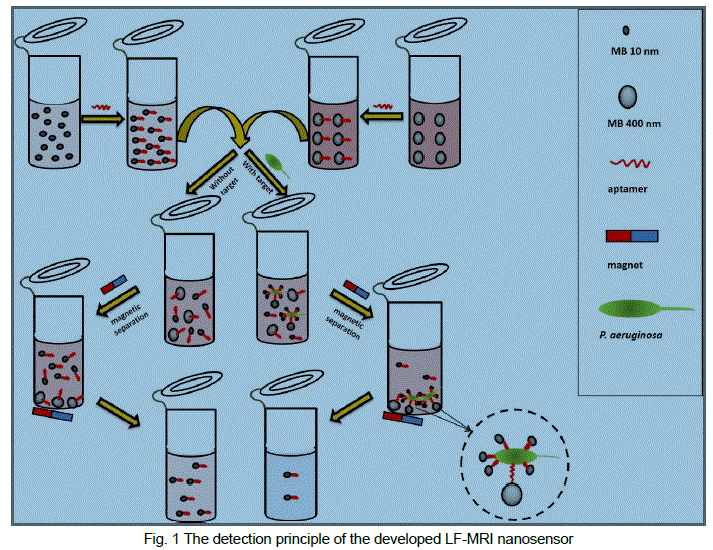 The whole-cell aptasensor for food-borne pathogens detection has attracted much attention due to its convenience and high sensitivity. In this work, we present a low-field magnetic resonance imaging (LF-MRI) aptasensor based on two different sizes of magnetic nanoparticles, 10 nm (MN10) and 400 nm (MN400) in diameter, respectively, for the rapid detection of Pseudomonas aeruginosa. In the absence of P. Aeruginosa, the MN10-bacteria-MN400 complex was formed with the help of anti-P. Aeruginos aaptamer, which can covalent immobilization onto magnetic beads via EDC/NHS chemistry. When magnetic field applied, the complex as well as MN400 are separated rapidly and the cleaved MN10 worked as contrast agent for MRI measurement. Under the optimum condition, the LF-MRI platform allows both image analysis and quantity detection of P. Aeruginosa, with the detection limit down to 100 cfu/ml. The feasibility and specificity of the aptasensor are demonstrated in detecting real food samples and validated by using plate counting methods. Moreover, the whole-cellapta sensor provide a promising platform for the quickly, directly and accurately determination of food-borne pathogens at cell-level.