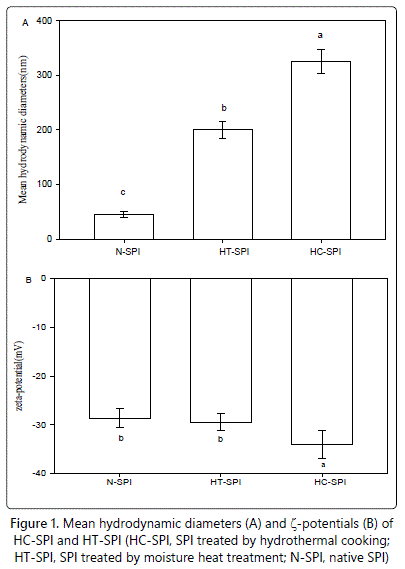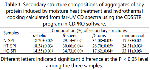 The thermal aggregation of the proteins in SPI dispersions (at pH 7.0) was evaluated by dynamic light scattering technique, and the mean hydrodynamic diameters of the protein aggregates formed are shown in figure 1. The mean hydrodynamic diameter of the proteins in untreated SPI dispersion (designated as N-SPI, served as control) was about 40 nm. As expected, the mean hydrodynamic diameter of the proteins in modified SPI dispersions treated by hydrothermal cooking (designated as HC-SPI) and moisture heat treatment (designated as HT-SPI) remarkably increased, indicating thermal aggregation of the proteins. Significantly higher value of mean hydrodynamic diameter of HC-SPI (about 325 nm), as compared to HT-SPI (about 200 nm) Figure 1 indicated much higher extent of protein aggregation in HC-SPI. This is well consistent with the turbidity data of the proteins (data not shown), suggesting that hydrothermal cooking, which included steam treatment with high temperature(121°C) and gauge pressure(0.1 MPa), was more favorable for aggregation of the proteins than heat treatment(especially 90°C in our study).