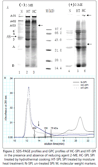 GPC was also performed to understand the aggregation behavior of the modified proteins by hydrothermal cooking and moisture heat treatment. The elution profiles of various samples are shown in figure 2B. The elution profiles of N-SPI showed major eluting peaks appearing at about 19 and 21 min, which attributed to β-conglycinin and glycinin, respectively. The molecular weights of the components were lower 158 kDa. In contrast, large aggregates were both observed for the treated-SPIs, as evidenced by the appearance of peaks eluting at 12.5 min and concomitant and significant decrease arround the typical peak areas (at 19 and 21 min). The average weights of heat-treated SPIs were over 669 kDa. It should be pointed out that the total peak area eluting at 12.5 min of HC-SPI was considerably smaller than that of HT-SPI, which seemed to be in contrary with the truth that hydrothermal cooking mediated a much higher extent of aggregation than moisture heat treatment, as evidenced by the significantly higher mean hydrodynamic diameters of HCSPI (Figure 1A). In fact, the additional filtration through 0.45 µm filters before GPC analysis may be a rational explanation for this decrease. Besides, a shoulder peak close to the peak at around 12.5 min, indicative of relative smaller aggregates, were observed only for HT-SPI, which may correspond to AG3 in the SDS-PAGE profiles (Figure 2A, lane 2). The above results further convinced that hydrothermal cooking was a stronger means to induce aggregation comparing with moisture heat treatment in our study.