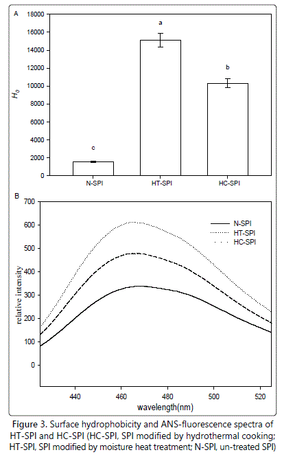 The surface hydrophobicity of native and treated SPI is presented in figure 3A. The surface hydrophobicity of native SPI was about 1500 (Figure 3A). However, the surface hydrophobicity of treated-SPI by moisture heat treatment or hydrothermal cooking rose dramatically to about 10000 and 15000, respectively, suggesting that lots of hydrophobic clusters initially distributed in the inner protein molecules were exposed to the molecule surface.