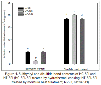 Figure 4 shows total free SH group contents and disulfide bond (SS) contents of native SPI and treated-SPI. In the native SPI, total free SH contents and disulfide bond (SS) contents achieved about 5.0 µmol/g and 18.4 µmol/g protein, respectively, which is consistent with former studies [34,35]. The free SH groups and disulfide bond (SS) contents may mainly attribute to glycinin in SPI, due to its much higher sulfhydryl group (approximately 6.3 µmol of free SH group/g of protein, assuming MW 320000) and disulfide bond (SS) contents as compared to β-conglycinin [36]. Moisture heat treatment resulted in significant decrease in total free SH contents and concomitant increase in disulfide bond (SS) contents (1.3 µmol/g proteins and about 20.1 µmol/g proteins, respectively)(Figure 4). Similar results had been observed in some other studies, taking other initial protein concentrations [37]. Unexpectedly, the total free SH content and disulfide bond (SS) contents of HC-SPI were almost unchanged as compared to N-SPI, with the value being 4.85 µmol/g proteins and 18.51 µmol/g proteins, respectively. SS bonds have been proved to play key roles both () HC-SPI and HT-SPI, indicated by SDS-PAGE profiles (Figure 2A, lane 3 and lane 6). Thus, discrepancy of SS bonds formation as for HC-SPI and HT-SPI may exist. The decrease of total free SH content in moisture heat treatment case was attributed to oxidation of the sulfhydryl groups or/and SH/SS interchange [34]. On the contrary, hydrothermal cooking in an autoclave system favored to disruption of all SS bonds followed by the rearrangement of SS/SH bonds through oxidation of the adjacent sulfhydryl groups [20]. Then, SS/SH bond rearrangement may occur in interprotein or/and intraprotein [20].