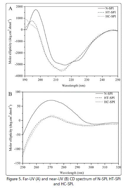 The tertiary conformations of HT-SPI and HC-SPI were analyzed by near-UV CD spectroscopic technique. The actual shape and magnitude of the near-UV CD spectrum of a protein will depend on the number of each type of aromatic amino acid present, their mobility, the nature of their environment (H-bonding, polar groups and polarisability), as well as their spatial disposition in the protein [40]. Figure 5B shows the near-UV CD spectra of N-SPI, HT-SPI and HC-SPI at pH 7.0. Compared to N-SPI, HT-SPI and HC-SPI exhibited significantly different patterns of CD spectra in the near-UV region, indicating that substantial differences existed in the arrangement/proximity and exposure of aromatic amino acids on the protein surfaces after moisture heat treatment or hydrothermal cooking. The decreases in ellipticity suggested that an increasing number of aromatic side-chains were exposed to a modified environment, and these changes are related to the loss of native-like structure.