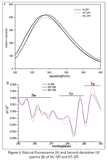 The intrinsic fluorescence spectrum is determined chiefly by the polarity of the environment of the tryptophan (Trp) residues and provided a sensitive means of monitoring the conformational changes in proteins and protein-protein as well as ligand-protein interactions [33]. The difference in the hydrophobic clusters on the molecular surfaces of the proteins in HT-SPI and HC-SPI could also be well reflected in intrinsic fluorescence spectral analysis Figure 6A. The emission fluorescence spectrum is determined chiefly by the polarity of the environment of the tryptophan and by their specific interactions and provides a sensitive means of characterizing proteins and their conformation, since the fluorescence emission maximum suffers a red shift when chromophores become more exposed to solvent [33]. The proteins in N-SPI showed a typical intrinsic fluorescence spectrum, with an emission maximum (λmax) at around 3 (Lange and Balny, 2002). The changes in amplitude, described 35 nm. This is a characteristic fluorescence profile of tryptophan residues in a relatively hydrophobic environment, such as the interior of a globulin [41]. In contrast, the λmax in HT-SPI and HC-SPI were about 336.5 and 338 nm, respectively. The observed red shift indicated that the Trp residues in HT-SPI were less exposed to the polar environment than that in HC-SPI.
