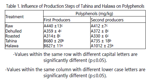 The difference in total polyphenols content (TPC) of the products of the various production steps followed by the two producers lies in the dehulling and roasting steps. Dehulling was carried out by the first producer by soaking seeds in salt solution, while the second producer used a peeler machine which is based on friction. Roasting was done by first producer using a mechanical oven at 130°C for 2 hours, while second producer roasted under pressure (5bar) at 130°C using six rotating cylindrical tanks. Raw seed samples from both producers had similar TPC, which may be due to the fact that the source of these seeds was Ethiopia. The TPC of these seeds were slightly lower than those of Rizki et al. [24] who reported that the content of these compounds extracted with 80% ethanol was 370 mg/kg. It is evident from data in table 1 that the TPC of the two producers showed a significant decrease after dehulling by about 18% for the first producer and 10% for the second. This indicates that the hulls may contain significant amounts of polyphenols. Roasting dehulled seeds negatively affected polyphenol content; TPC content decreased significantly (p ≤ 0.05) after 2 hrs of roasting at 130°C by about 12.5% compared to dehulled seeds. This finding agrees with that of Rizki et al. [24] who reported that TPC decreased in sesame seeds roasted by microwave. Riziki [25] reported that roasting sesame seeds at 150°C for up to 90 min significantly increased the TPC but then decreased it toward the end of roasting period (360 min). They attributed the increase in TPC to production of Maillard reaction products generated during roasting which can be measured by Folin-Ciocalteu reagent. The amount of TPC in tahina of the two producers was about twice that of the dehulled sesame seeds. The increase in TPC in tahina could be due to the severe mixing during processing which ruptures seed cells releasing more polyphenols extractable by the solvent used in this study. The amount of TPC in halawa was about 2.5 times that in the dehulled seeds. This increase could also be due to the severe mixing of the seeds and to polyphenols from the wart root extracts (soap root) which was added as an emulsifier. This increase could also be due to Maillard reactions. The results shown in table 1 indicate that there were significant (p ≤ 0.05) effect of the processors on TPC. The TPCs of the dehulled, roasted, tahina and halawa produced by the second processor were significantly higher than those produced by the first processor.