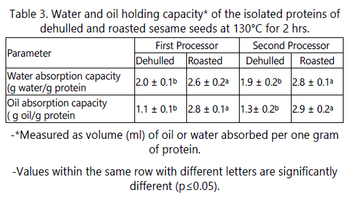 Oil absorption capacity depends on several factors such as type and source of protein, protein particle size and whether or not it is subjected to heat treatment. As shown in table 3, oil absorption capacity for the raw dehulled sesame seeds was about 1.2 g/g protein, similar to that reported by Kanu [27]. However, these results disagree with those of Zhao [5] who reported higher oil holding capacity of sesame protein isolate (2.7 g/g protein), which might be due to the type and source of sesame seeds and to the method of protein extraction. However, roasting at 130°C for 2 hours increased the oil holding capacity by about 2 fold. These results could be due to the partial denaturation of proteins with exposition of hydrophobic amino acid groups during roasting. The presence of several non-polar side chains may bind the hydrocarbon chains of fats, thereby increasing absorption of oil. Results in table 3 indicate that the raw dehulled sesame seed exhibited lower oil holding capacity than water holding capacity.