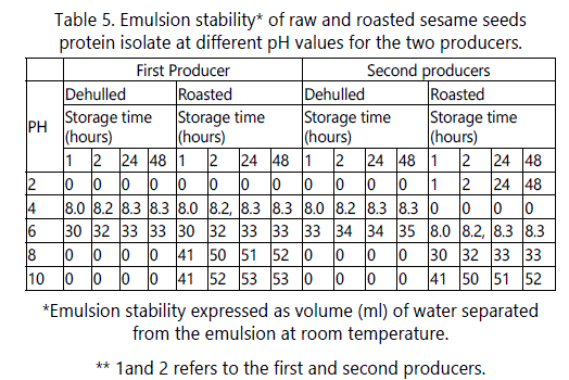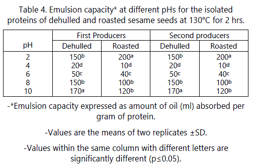 The effects of pH on the emulsifying capacity (EC) of dehulled and roasted sesame seeds from the two producers are shown in table 4. As shown in table 5, no significant effect occurred due to the producers on the emulsion capacity (EC) of the dehulled and roasted seeds. The minimum emulsion capacities of dehulled and roasted sesame seeds from the two producers at pH 4 (near isoelectric point) were 20 and 10 ml oil/g protein, respectively. This is due to the fact that at the pI of protein, the net charge is zero which enhances proteinprotein interaction. Therefore, protein precipitate and will not be able to migrate to protein oil interface leading to minimum EC at this pH [28]. These results agree with those of Kanu et al. [27] and Khalid et al. [29]. These results partially agree with those of Zhao et al. [5] who reported that EC for roasted sesame seed protein was minimal at pH 2-7 range and these EC were not significantly different.