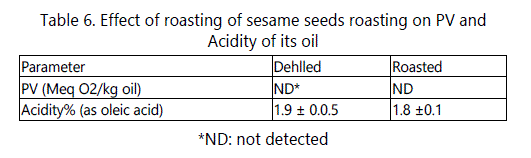 The results reported in table 6 show that the roasting process did not affect PV and the acidity of the extracted oil. These results disagree with those of Manal and Hassan [26] who reported that the roasting process for sesame seeds (200°C for 15 min) resulted in an increase in PV and in the acidity of their oils.