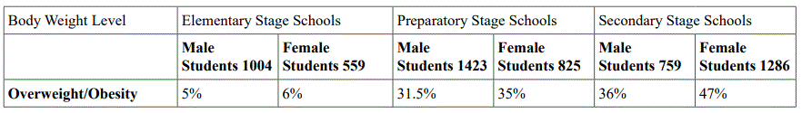 2. The overweight/obesity rate has increased in the preparatory schoolsʼ stage and reached 31.5% for malesʼ students and 35% for females students.