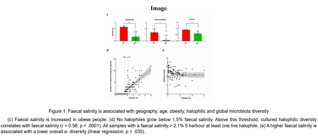 Fecal salinity was associated with obesity independently of geographical origin, gender and age. The first 2 human-associated halophilic archaeal members were isolated along with 64 distinct halophilic species, including 21 new species and 41 known in the environment but not in humans. No halophiles grow in less than 1.5% salinity. Above this threshold, the richness of the halophilic microbiota was correlated with faecal salinity (r = 0.58, p < .0001). Metagenomics linked high faecal salinity to decreased diversity (linear regression, p < .035) and a depletion in anti-obesity Akkermansia muciniphila and Bifidobacterium, specifically B. longum and B. adolescentis. Genomics analysis suggested that halophilic microbes are not only transient passengers but may be residents of the human gut.
