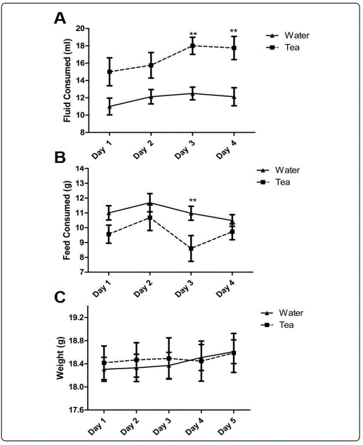 Moringa Tea Consumption. During the dosing period all mice had free access to feed, and either water or tea for four -24-hour periods (4 days). Consistent with our previously reported findings [20]. Mice in this study consumed Moringa tea at the same or at higher rate than water (Figure 1A). There were no significant differences in feed consumption or weight between the water or tea groups during the 4-day dosing period (Figure 1B and C).