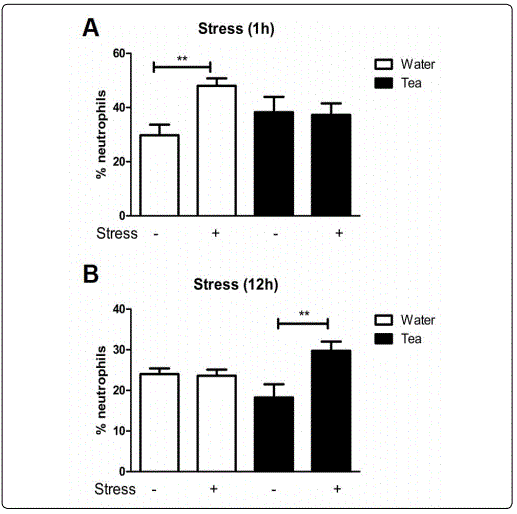Stressed Induced Changes in Circulating Neutrophils Are Altered by Consumption of Moringa Tea. To determine the effect Moringa tea consumption has on stress induced immunomodulation, mice in the water or Moringa tea groups were placed in stressed or unstressed conditions. Acute stress is shown to lead to increases in circulating neutrophils. In this study mice that drank water and were exposed to 1 hour of stress had significant increases in circulating neutrophils as expected. However, no change in the level of circulating neutrophils was observed in mice that consumed Moringa tea (Figure 2A). With more prolonged stress (12 hours), the Moringa tea group showed significantly higher levels of blood circulating neutrophils as compared to their non-stressed counterparts (Figure 2B).In contrast, stress had no effect on the level of circulating neutrophils in mice that consumed water (Figure 2B). Together these data suggest that Moringa tea modulates the impact of stress on neutrophils; abrogating the changes induced by 1 hour of stress but enhancing that of longer stress induction.