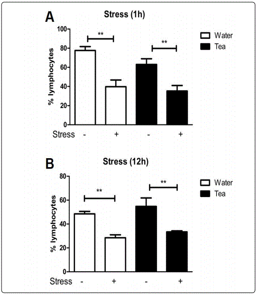 Moringa Tea Does Not Impact Stress Induced Modulation of Lymphocytes. One hour of restraint stress in mice causes increases in blood neutrophils and decreases circulating lymphocytes [4]. For this study, one hour of stress resulted in significant decreases in circulating blood lymphocytes when compared to their unstressed counterparts in both the water and the Moringa tea groups. No significant differences between the dosing groups (water vs. tea) were observed (