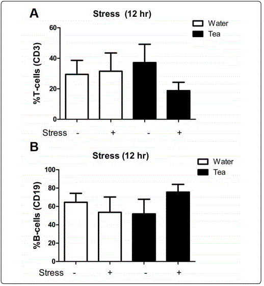 Figure 3A). Similar results were found when mice underwent 12-hours of restraint stress (Figure 3B). Flow cytometry was used to determine if there were specific changes to the percentages of T and B-cells that could not be detected with differential cell staining. No significant changes in the percent of circulating T (CD3+) or B (CD19+) cells after stress in either the water or tea groups were observed (Figure 4A and B). This suggests that Moringa tea does not affect stress induced modulation of lymphocytes within the blood.