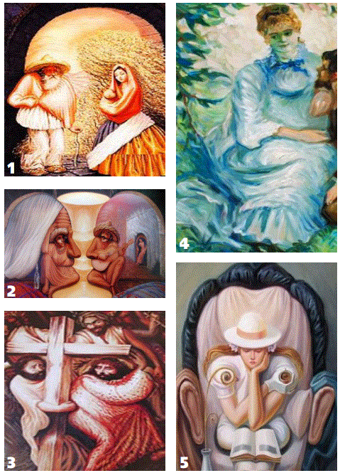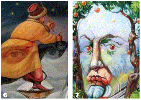 The interesting fact is that at first glance a regular face is observed, however in-depth look an irregular face is revealed. This fact makes these paintings extremely creative artworks that demonstrate the process of perception of human’s brain. Figures.1, 2 and 3 were painted by the Mexican artist Octavio Ocampo born in 1943 were his artworks are characterized by the phenomenon that one painting hides more paintings. Figures 4-7 are artworks painted by the Russian optical illusion painter Oleg Shuplyak born in 1967. His artworks involve portraits of famous personalities drawn in such a way that common objects and scenery make up their distinctive faces in amalgamated form. Figure.4 demonstrates the French artist Pierre-Auguste Renoir who was a leading painter in the development of the Impressionist style. Figure.5 demonstrates the Spanish surrealist painter Salvador Dali best known for the striking and bizarre images in his surrealist work. Figure.6 demonstrates the Russian-French artist Marc Chagall whose paintings are characterized by a world of fantasy and dream. And Finally Figure.7 demonstrates the image of the English physicist Isaac Newton. In conclusion it may be said that although the faces are demonstrated from unusual different images, their composition in the form of a regular face will give the observer the impression of the regular face.