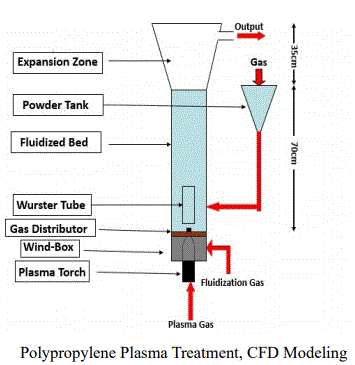 The plasma torch was introduced into transparent glass reactor with 118mm insidediameter, placed in the middle of a bronze gas distributor. An internal Wurster tube was added to control the residence time of particles in the plasma jet, and therefore the homogeneity of the treatments. The innovative design of wurster tube improved the powders treatment process by increasing the interaction between plasma torch and the particles, therefor the efficiency of system increased.