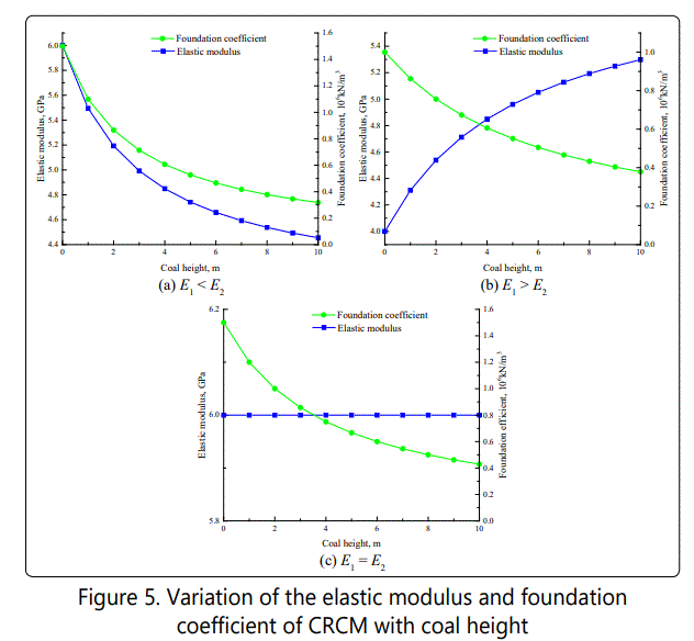 In terms of the change of foundation coefficient of CRCM, the trends are quite different from the change of modulus of CRCM as a result of the increasing of coal height causing CRCM height increasing as well. Therefore, the trends all decreases with the increasing of coal height under three conditions regardless of the relative relationship between the elastic modulus of coal and the elastic modulus of rock.