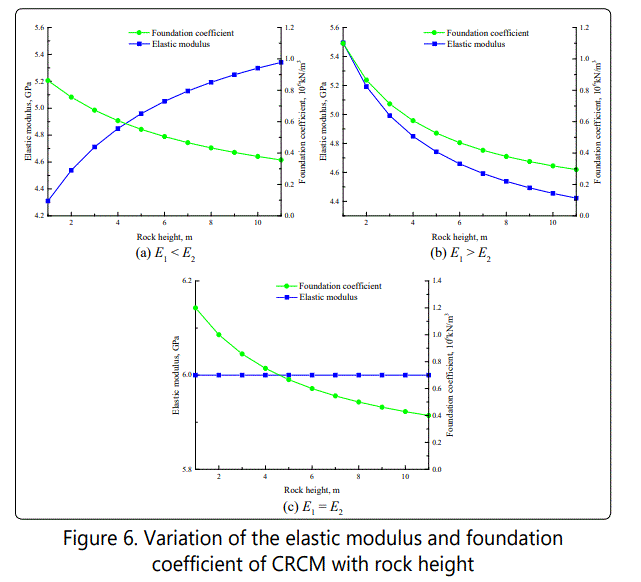 In terms to the foundation coefficient of CRCM, due to the increasing of rock height also causing CRCM height increasing, the change trend all decreases under three conditions regardless of the relative relationship between the elastic modulus of coal and the elastic modulus of rock.