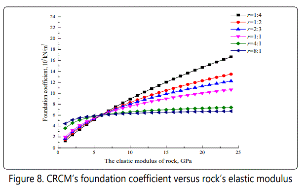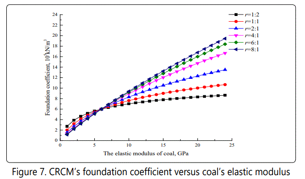 According to Figure7, it indicated that the foundation coefficient of CRCM increases with the increasing of coal's elastic modulus regardless of the height ratio of coal to rock and the tendency to change reduces. In details, the changing of the foundation coefficient of CRCM is nonlinearly with the increasing of coal's elastic modulus when coal's elastic modulus is smaller than rock's elastic modulus, while this changing is approximately linearly with coal's elastic modulus increasing under the condition of coal's elastic modulus greater than rock's elastic modulus. Meanwhile, when the height ratio of coal to rock is relative small, the changing of coal's elastic modulus has remarkable effect on the mechanical characteristics of CRCM under coal's elastic modulus smaller than rock's elastic modulus. On the contrary, there is no significant effect on the mechanical characteristics of CRCM under coal's elastic modulus greater than rock's elastic modulus. On the other hand, when the height ratio of coal to rock is relative large, the influence of the relative relationship between coal's elastic modulus and rock's elastic modulus on the foundation coefficient of CRCM becomes less prominent. That is to say, there is remarkable effect on the foundation coefficient of CRCM in the entire range of coal's elastic modulus.
