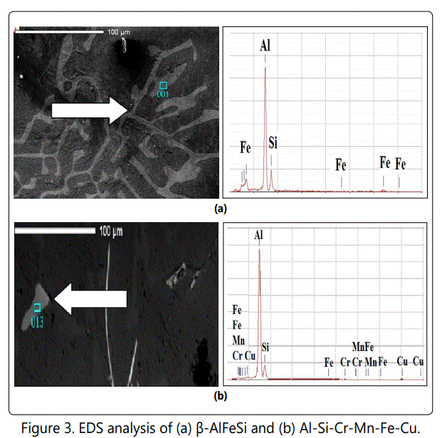 It is clear that Cr addition does not have significant effect on Si morphology as showed in Figure 2, that due to forming phase and modified Fe phase and reduce the quantity [13]. The Si particles display the acicular plate/flake form of the eutectic silicon phase of base alloy and Cr-coning alloy. Similar result was obtained by Timelli and Bonollo [6].