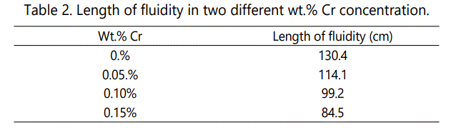 The length of fluidity of the aluminum LM6 and additive Chromium are shown in Table 2. In the spiral mold, the length of fluidity is shortened noticeably by presenting of Cr addition. While the fluidity length of LM6 alloy decreases gradually with increase value of Cr from 130.45 cm to 84.5 Cm. The main cause of this reduction is formation of sludge. According to segregation factor (SF) equation, sludge formation is dependent on alloy's chemistry and specially Cr [16, 17]. The sludge could be precipitate as primary phase and acts as an obstacle for fluidity of molten metal. Segregation factor (SF) is useful to determine Fe, Mn, and Cr contents to prevent sludge formation [14]. Cr obviously is the most harmful element for the formation of sludge. According to Eq.1 and chemical composition of the specimens, sludge factor for both base metal (LM6) and the material with Cr addition is calculated.