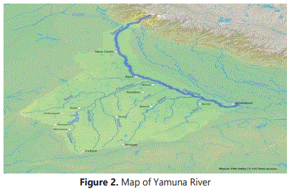 It is Indiaʼs longest tributary and has also considered as the second largest Ganga tributary river. Its origination begins from Yamunotri Glacier of Banderpooch peaks in Uttarakhand as shown in Figure 2; it is stretch of about 1,376 kilometers [1]. It converges Triveni Sangam, Prayagraj though emerging with the Ganga River [3]. It passes through all major states in north India, and gets converge with other tributaries followed by Sindh, the Betwa, and Ken [7]. The river flows from Uttarakhand into the state of Himachal Pradesh [8]. It assists around 70% of Delhiʼs water supply [9]. It also has a mythological status like Ganga and has a spiritual standard in Hinduism [1].